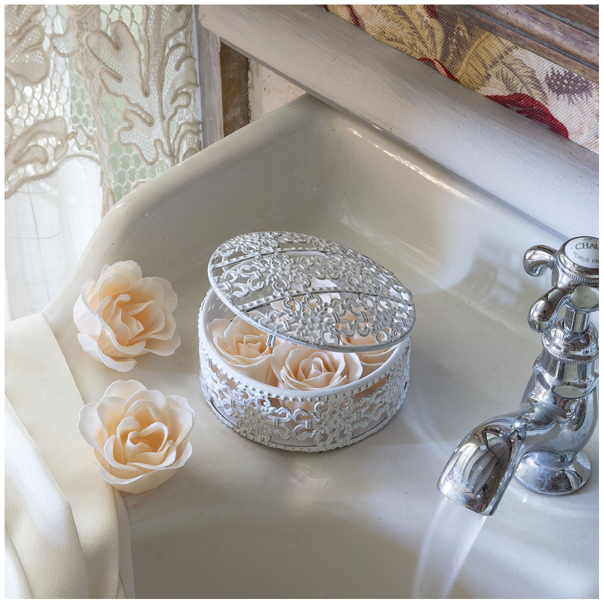 Ofereça a si mesmo um momento delicado de cuidado e bem-estar com este elegante coffret com caixa metálica contendo 6 rosas de sabonete perfumadas em tom nude. Cada rosa é composta por pétalas de sabonete que se dissolvem em contacto com a água, criando uma espuma suave que limpa delicadamente as mãos e deixa uma fragrância subtil e agradável.
