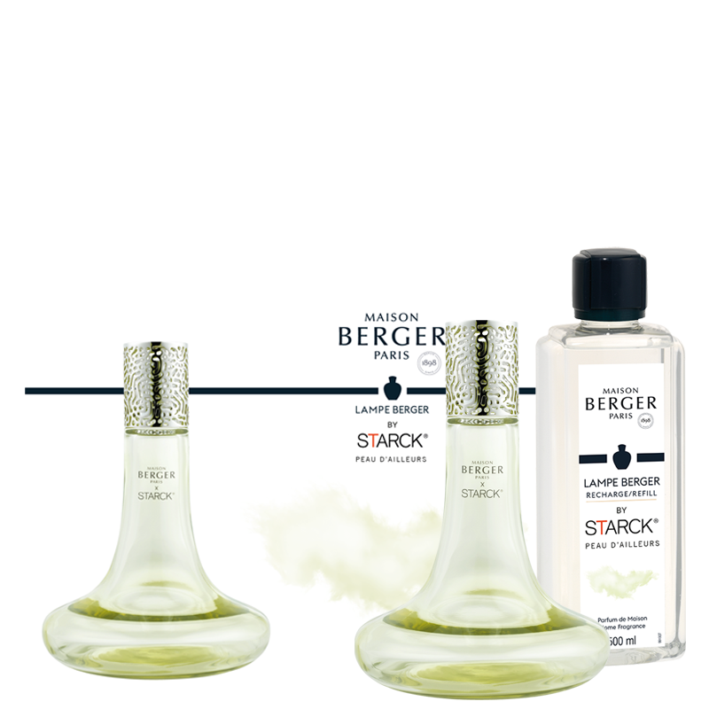 Tampa em liga metálica prateado brilhante. Um queimador catalítico, um funil e 500ml de perfume Peau d’Ailleurs.