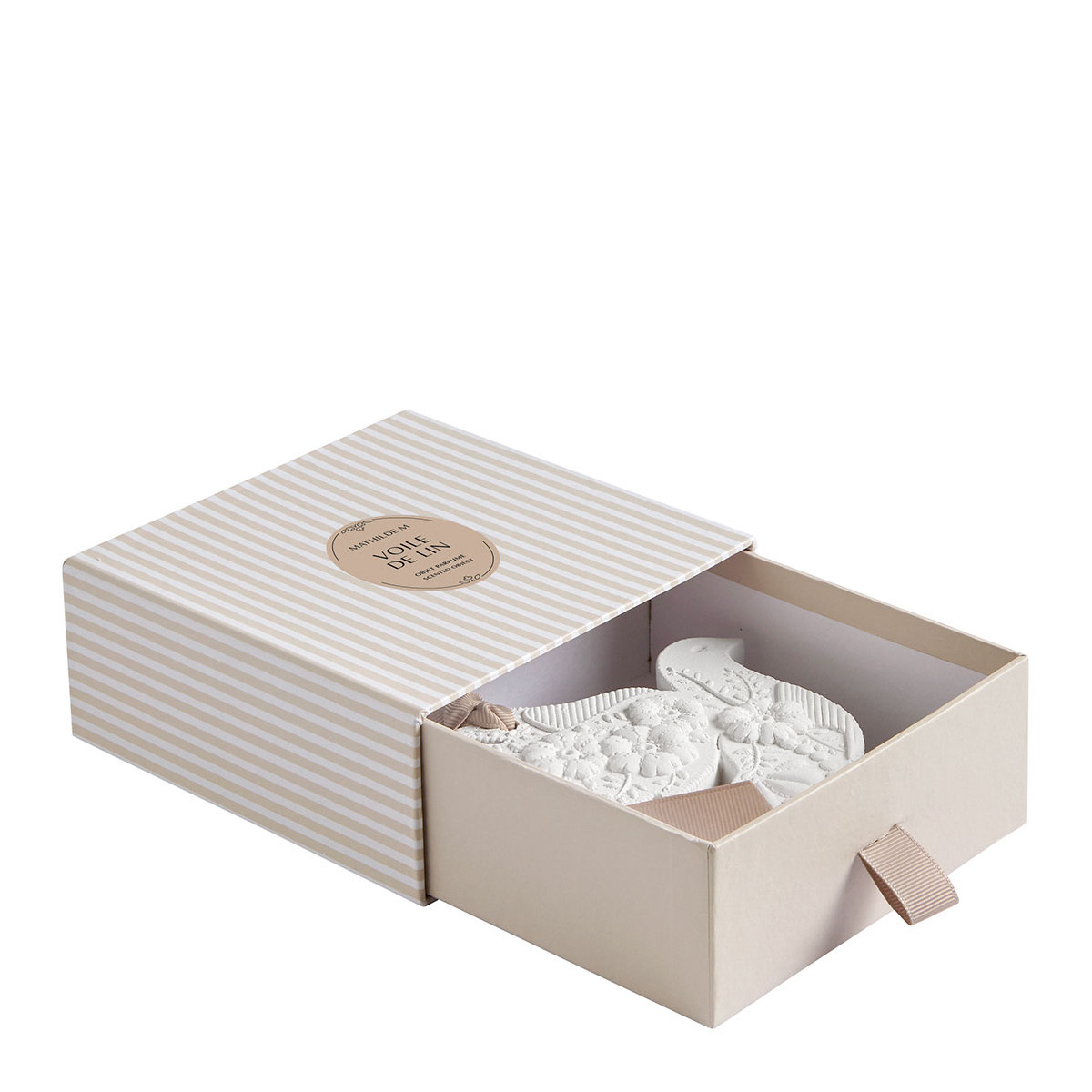 Emblemáticas da marca, as decorações em gesso Mathilde M são delicadamente perfumadas e produzidas artesanalmente nos ateliers da marca, seguindo métodos tradicionais. Cada peça é cuidadosamente trabalhada pela escultora ornamental, garantindo acabamentos refinados e um caráter único.