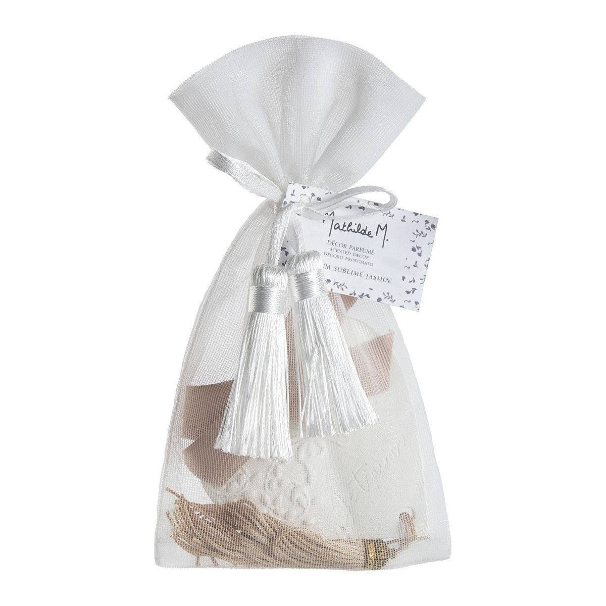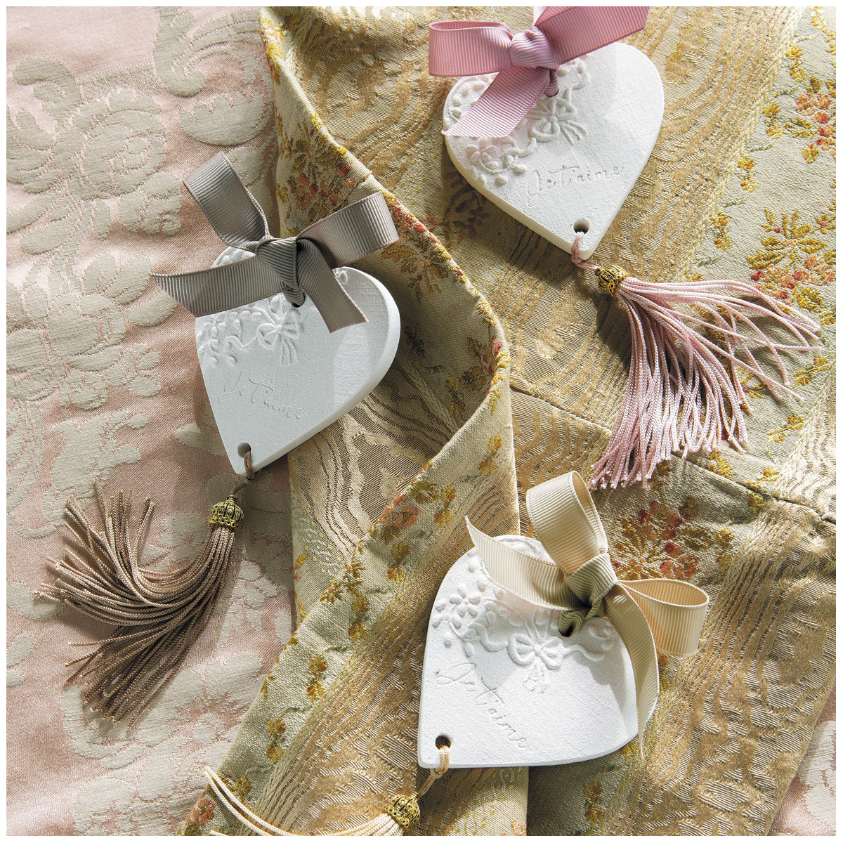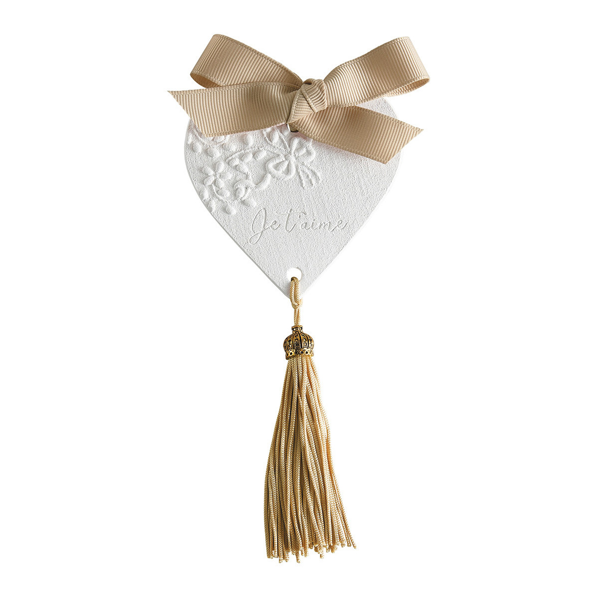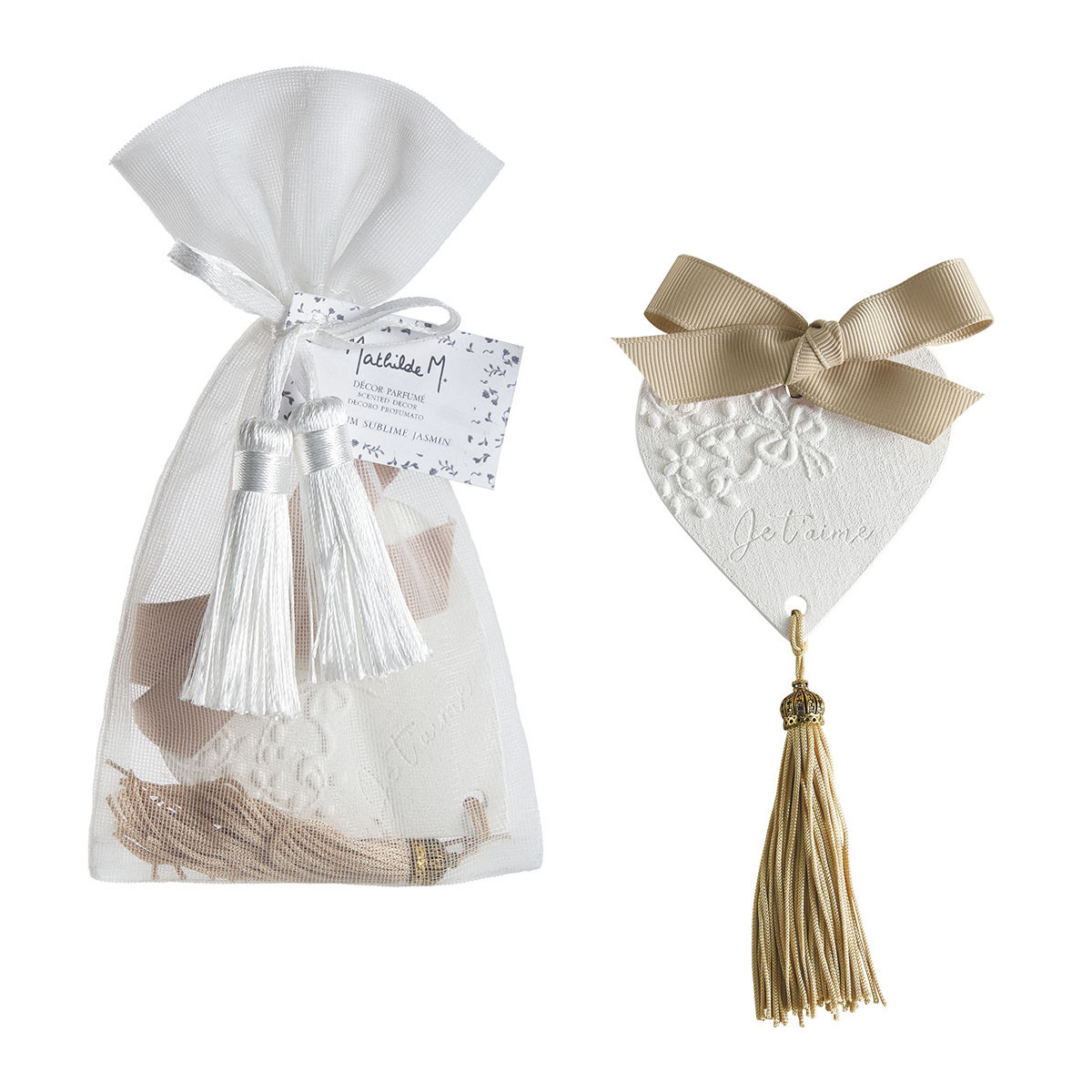 Deixe-se encantar por esta delicada decoração perfumada em gesso Je t’aime, em forma de coração. Acompanhada por um elegante pompom decorativo, perfuma durante muito tempo pequenos espaços da casa, como gavetas, armários ou malas, com Sublime Jasmin, uma fragrância intensa e viciante que combina com elegância as notas luminosas de jasmim e flor de laranjeira sobre uma suave nuvem de baunilha e almíscares brancos. Uma peça encantadora, ideal para oferecer a alguém especial.