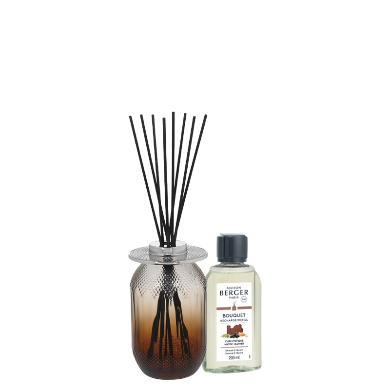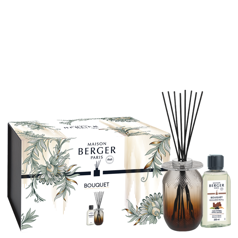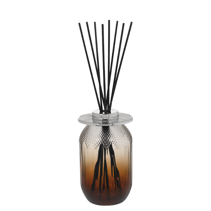 Difusor de bouquet recarregável em vidro com anel metálico, com 200ml de perfume. Incluí 8 varetas de polímero técnico.