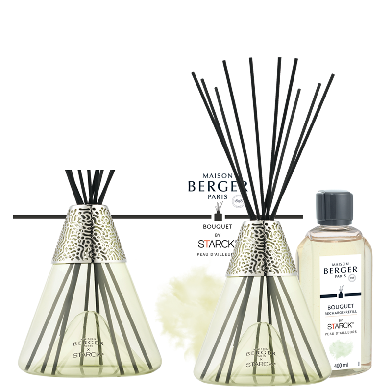 Difusor de bouquet recarregável em vidro com anel metálico, com 400ml de perfume. Incluí 10 varetas de polímero técnico.