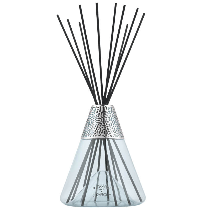 Difusor de bouquet recarregável em vidro com anel metálico, com 400ml de perfume. Incluí 10 varetas de polímero técnico.