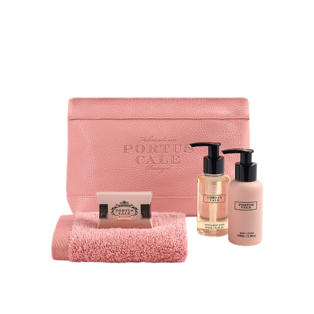 O Kit de Viagem Rosé Blush da Portus Cale foi concebido para acompanhar a sua rotina de cuidados pessoais em qualquer lugar. Completo e funcional, este conjunto reúne vários essenciais de higiene e bem-estar em tamanhos práticos de viagem, permitindo manter o conforto e a fragrância da sua coleção favorita mesmo fora de casa.