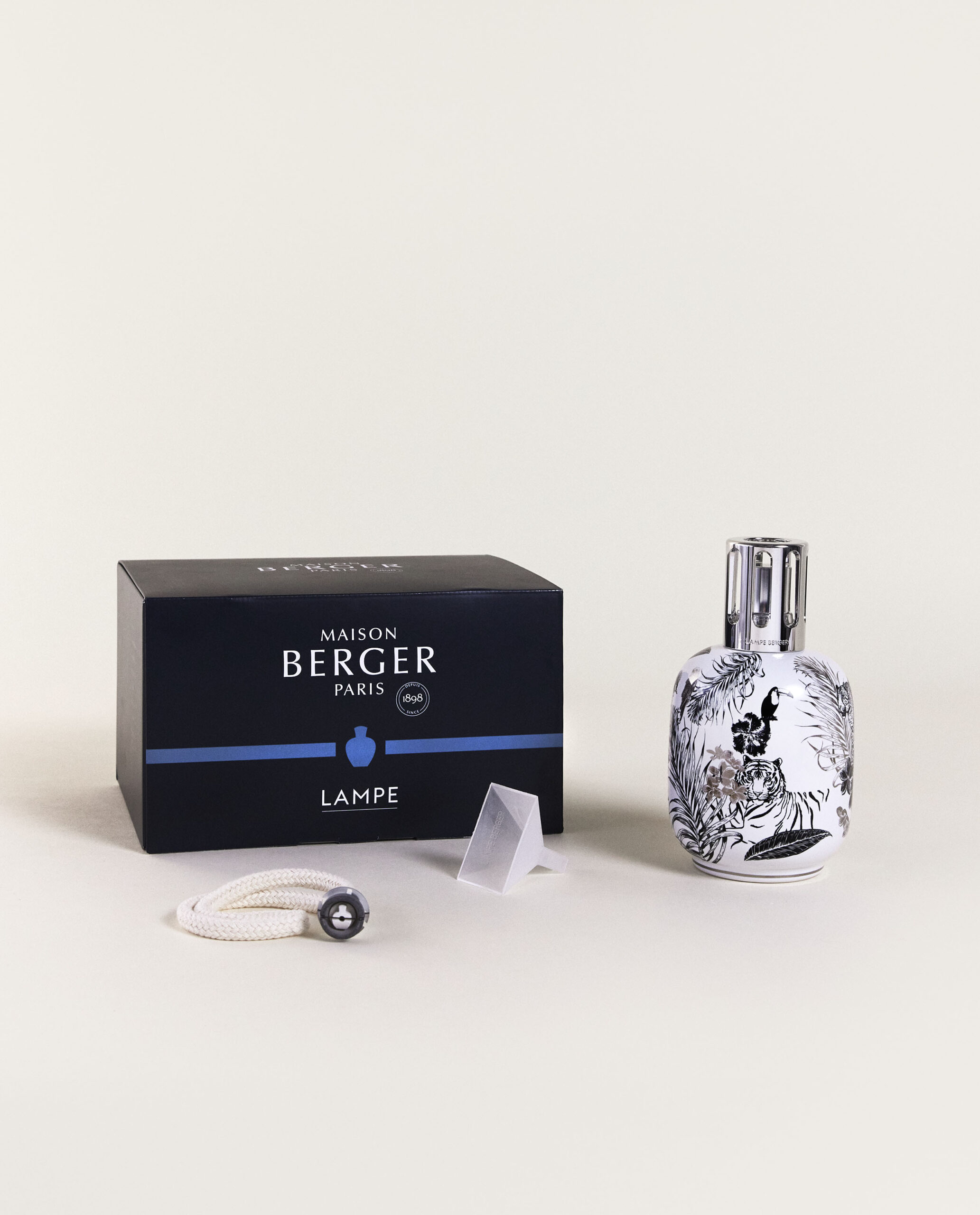 Tampa em liga metálica prateada brilhante. Um queimador catalítico, e um funil.