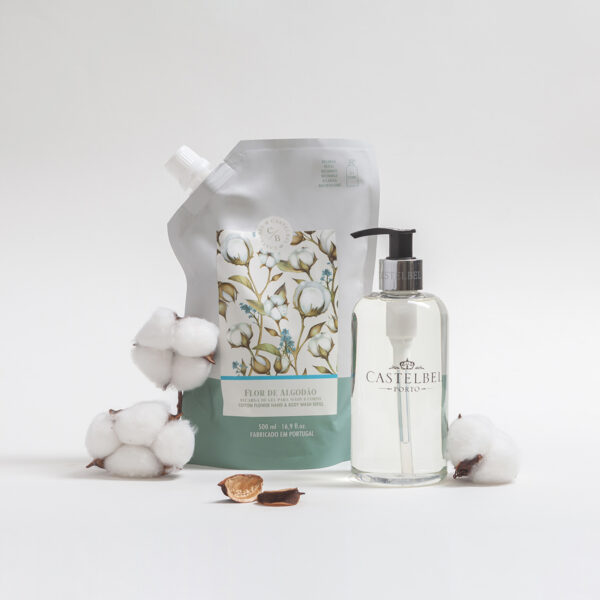 A Recarga de Gel para Mãos e Corpo Flor de Algodão da Castelbel foi criada para oferecer uma forma prática e ecológica de continuar a desfrutar do seu sabonete líquido perfumado. Produzida com até 60% de material reciclado pós-consumo, esta recarga representa uma alternativa mais sustentável que ajuda a reduzir o desperdício de embalagens.